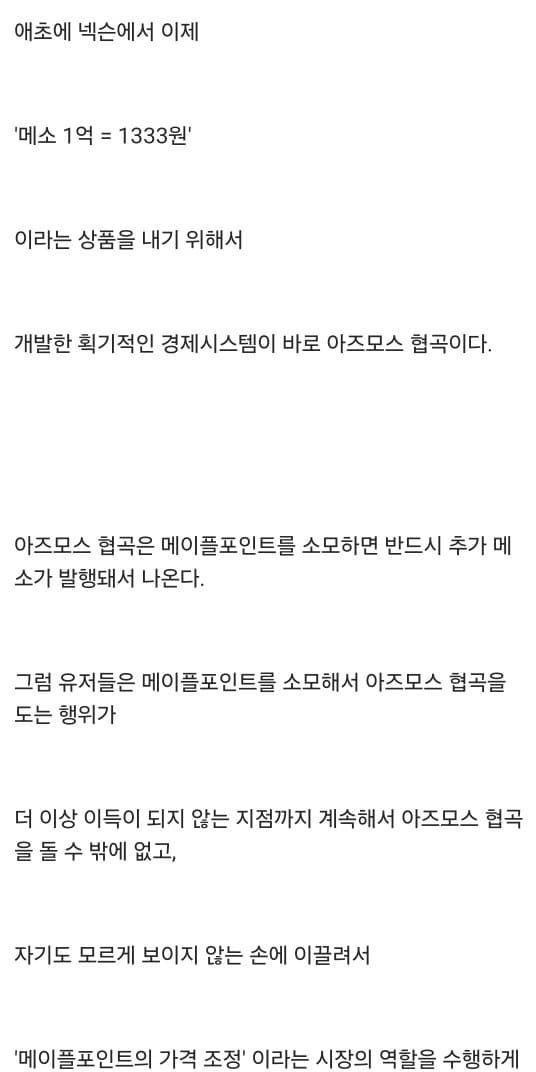 사실상 메이플포인트(현금)으로 메소를 구매하는 컨텐츠인데 이걸 넥슨에서 비율을 약 13000 포인트면 10억을 얻을 수 있게 설계해