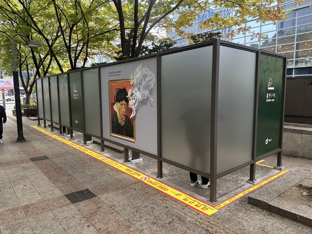 개방형 흡연 부스는 강화유리와 철재 프레임으로 제작했다. 미로식 설계로 내부가 보이지 않아 흡연자들의 사생활이 보호되고, 하늘이 뚫려 있어 내부에 연기가 고이지 않는다. 대신 높이를 2.5m로 높게 둘러 흡연부스 근처를 지나는 보행자의 간접흡연도 최소화했다.