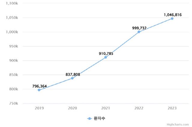 28일 건강정보심사평가원의 ‘국민관심질병통계’에 따르면, 지난해 우울증 환자 수는 104만 6816명으로 집계됐다.