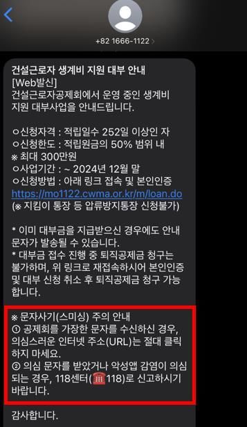 현재 공제회는 퇴직공제금 청구 및 긴급 생계비 대부 신청 안내 시 대표 전화번호(1666-1122)를 통해 문자 발송하고 있다. 해당 번호가 아닌 경우 스미싱 문자일 가능성이 크다.