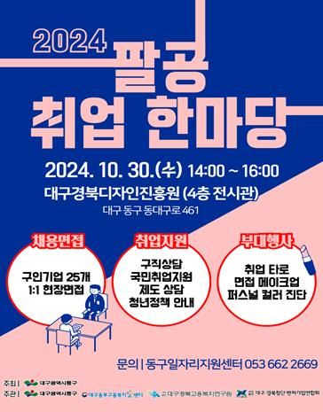 대구 동구청이 주최하고, 대구동부고용복지+(플러스)센터, (사)대구경북고용복지연구원, (사)대구·경북첨단·벤처기업연합회가 함께 주관하는 ‘팔공취업한마당’은 민선8기 공약인 ‘청년·중년 JOP 페어링 프로젝트’의 일환으로, 구직자에게 양질의 일자리 정보와 최신 고용 동향을 제공하고, 기업은 현장 면접을 통해 필요한 인력을 채용할 수 있다.