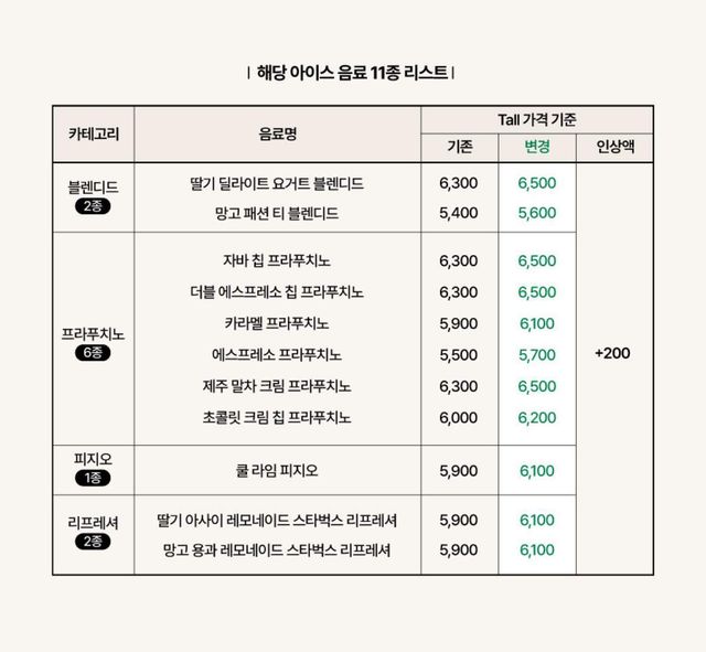 프라푸치노 제품군에서는 ‘자바칩 프라푸치노’, ‘더블 에스프레소 칩 프라푸치노’, ‘제주 말차 크림 프라푸치노’가 6300원에서 6500원으로, ‘카라멜 프라푸치노’는 5900원에서 6100원으로 상향 조정된다. 피지오와 리프레셔 일부도 5900원에서 6100원으로 가격이 오른다.