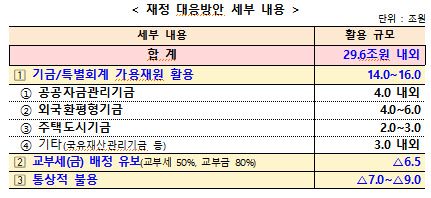 우선 기금 및 특별회계에서 14~16조원 규모의 가용재원을 끌어오기로 했다. 외평기금이 4~6조원으로 규모가 가장 클 것으로 예상되며, 이 외에도 △공공자금관리기금(4조원 내외) △주택도시기금(2~3조원) △국유재산관리기금(3000억원 수준) 등이 활용될 예정이다.