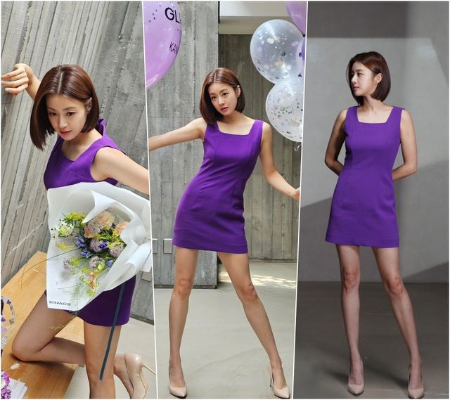 사진 속 강소라는 보라색 미니 원피스를 입고 늘씬하면서도 글래머러스한 자태를 과시해 눈길을 사로잡는다. 특히 꽃다발을 들고 촬영한 사진에서는 한쪽 다리를 의자에 올려 그의 탄탄한 각선미가 돋보여 눈길을 사로잡는다.