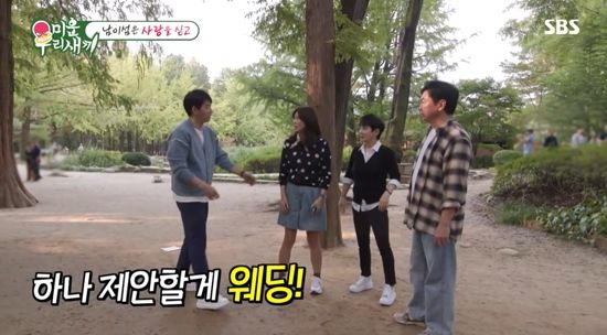 짚라인을 타고 남이섬에 도착한 두 커플. 네 사람을 목격한 시민들이 “결혼하세요”라며 응원하자 김승수는 “그래볼게요”라고 답해 눈길을 끌었다. 이어 두 사람은 드라마 ‘겨울연가’ 명장면 눈사람 뽀뽀씬을 따라하며 둘만의 추억을 남겼다.
