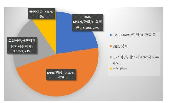 최 회장 측이 자사주를 제3자에게 매각해 우호 지분을 추가할 수도 있지만, 이미 제3자배정 유상증자나 상호출자 형태로 우호 세력을 확보한 상황에서 추가적인 자사주 매각은 쉽지 않다. MBK 측에서 신주발행 무효 소송을 제기할 가능성이 높기 때문이다. 때문에 최윤범 회장 측과 MBK·영풍의 지분 구도는 3%포인트 미만 수준의 격차로 예상된다.