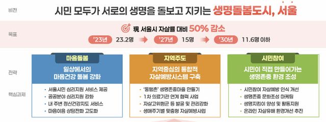 서울시는 코로나19 팬데믹 이후 더욱 깊어진 서울시민의 외로움과 경제·사회적 복합원인으로 증가하고 있는 자살문제 해결에 적극 나선다. 지금까지는 자살시도자 등 고위험군을 대상으로 집중적인 관리를 펼치쳐 왔다. 그러나 이제는 시민들이 일상 속에서 마음건강을 지속적으로 돌보며 외로움과 고립감을 줄이고 이를 통해 자살위험을 낮춰나가는 포괄적 지원 방식으로 정책 패러다임을 전환한다.