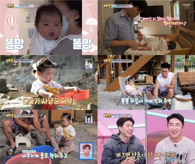 오는 30일 방송되는 KBS 2TV ‘슈돌’ 546회는 ‘우리 모두 사랑하지우!’ 편으로 2MC 최지우, 안영미와 슈퍼맨 장동민, 딘딘, 박수홍, 김준호, 제이쓴이 함께했다. 이중 박수홍은 생후 14일 차 된 딸 전복이의 모습을 공개해 반가움을 전했고, 지우는 아빠 장동민과 어촌 체험부터 부추전, 족발을 만들어 먹으며 자급자족 삼시세끼에 성공했다. 또한 니꼴로는 삼촌 딘딘과 할머니의 생신상을 준비하는 기특한 모습을 보였다.