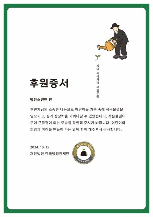 10월의 희망배달부 BTS 진 후원증서. ⓒ 인포뱅크