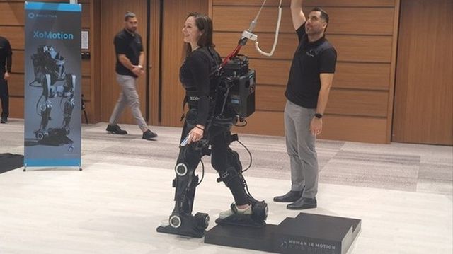 베노티엔알이 지난해 10월 진행한 웨어러블 로봇 시장 진출 간담회 현장에서 하반신 마비 장애인 클로이가 직접 웨어러블 로봇 '엑소모션'을 입고 계단을 걷는 고난이도의 동작을 선보였다. = 박기훈 기자
