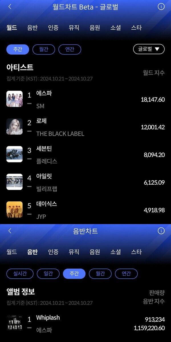 주간 월드차트에서는 에스파가 무서운 기세로 정상에 올랐다. 에스파는 음반과 음원 부문에서 높은 점수를 획득하며 1만8147.60점의 월드 지수로 1위를 점했다. 이어 로제가 월드 지수 1만2001.42점으로 2위, 세븐틴이 월드 지수 8094.20점으로 3위에 자리했다.