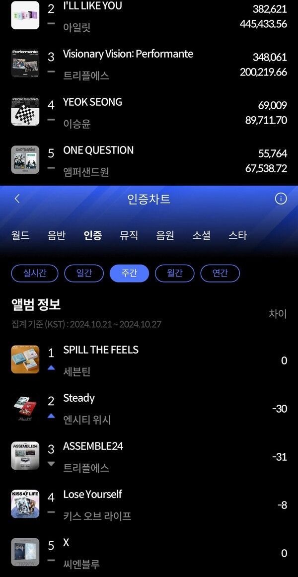 주간 인증차트에서는 세븐틴의 미니 12집 'SPILL THE FEELS'가 1위를 기록했다. 세븐틴의 미니 12집 'SPILL THE FEELS'는 지난 한 주간 중국(홍콩) 지역에서 가장 높은 인증률을 보였고, 영국이 그 뒤를 이었다. 2위는 엔시티 위시 미니 1집 'Steady', 3위는 트리플에스 정규 1집 'ASSEMBLE24'다.