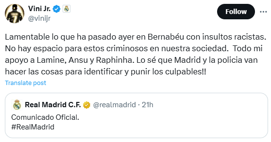 비니시우스도 곧바로 해당 발언을 한 팬들을 규탄했다. 자신의 X(구 트위터)를 통해 “베르나베우에서 인종차별적 모욕이 나온 데 유감을 표한다. 그런 범죄가 우리 사회에 설 자리는 없다. 야말과 안수 파티, 하피냐에게 무한한 지지를 보낸다. 레알과 마드리드 경찰은 그들을 찾아내 처벌할 것”이라며 강력한 대응을 촉구했다.