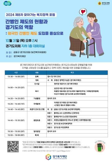 토론회는 10월 31일 경기도의회 지하1층 대회의실에서 경기복지재단의 ‘찾아가는 복지정책 포럼’의 일환으로 '간병인 제도의 현황과 경기도의 역할: 외국인 간병인 제도 도입을 중심으로'를 주제로 열린다.