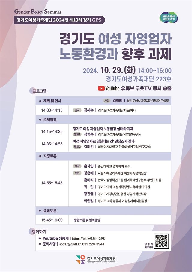 경기도여성가족재단은 이와 같은 경기도 여성 자영업자 노동환경 실태조사 결과를 토대로 향후 정책 방향을 논의하기 위해 29일 제13차 경기GPS(Gender Policy Seminar)를 개최한다.