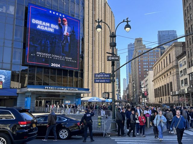27일(현지시간) 오후 12시 뉴욕 맨해튼 내 매디슨 스퀘어 가든(MSG) 벽 한 켠에는 도널드 트럼프 전 대통령을 선전하는 큰 전광판이 걸려 있었다. NBA 뉴욕 닉스의 홈구장이자 전 세계에서 가장 유명한 경기장 중 하나인 MSG 바깥에는 ‘45-47(45-47번째 미 대통령)’ 숫자와 ‘미국을 다시 위대하게’(MAGA: Make Aerica Great Again) 구호가 적힌 빨강 모자의 바다로 변했다. 오후 5시 예정된 트럼프의 뉴욕시 유세를 보기 위한 지지자들의 물결 탓이다.