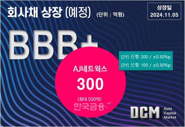 25일 금융감독원 전자공시에 따르면 AJ네트웍스는 300억원 규모의 무보증 회사채를 발행한다. 이번 발행은 2년물 200억원, 3년물 100억원으로 구성되며, 최대 500억원 한도 범위 내에서 증액이 가능하다.