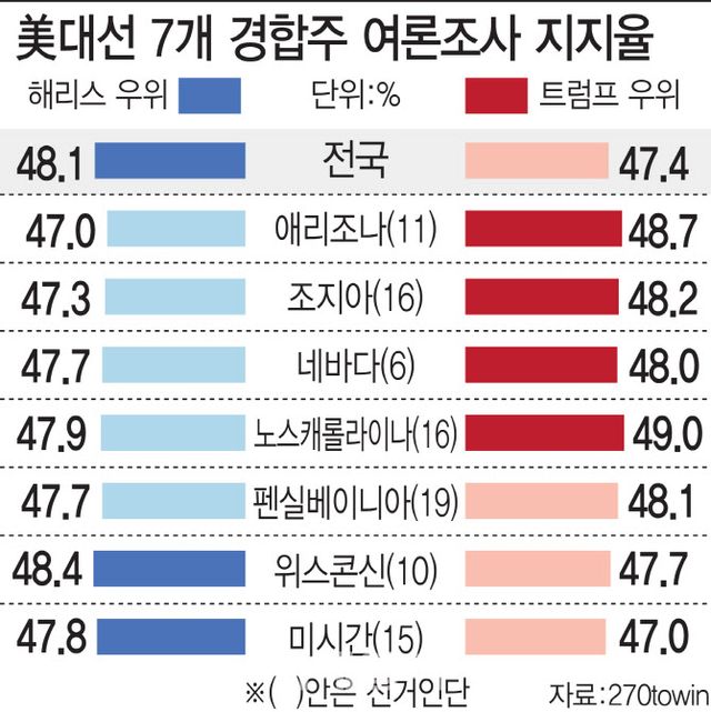 현재 경합주 7곳을 제외한, 즉 두 후보 간 지지율 격차가 뚜렷한 소위 민주당·공화당 ‘텃밭’의 선거인단을 각 후보가 확실히 가져간다고 봤을 때 해리스 부통령은 226명, 트럼프 전 대통령이 219명의 선거인단을 확보할 전망이다. 불과 7명 차이여서 7개 경합주가 ‘캐스팅 보트’가 될 수밖에 없는 상황이다. 경합주 7곳의 선거인단 수는 위스콘신(10명)·미시간(15명)·펜실베이니아(19명)·노스캐롤라이나(16명)·조지아(16명)·애리조나(11명)·네바다(6명) 등 총 93명이다.
