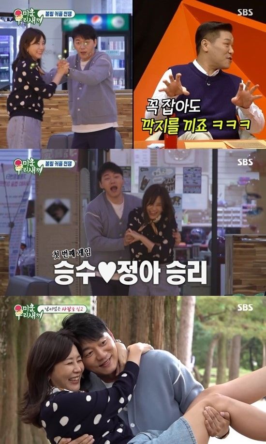 27일 방송된 SBS '미운 우리 새끼'에서는 임원희, 안문숙과 김승수, 양정아의 더블 데이트가 공개됐다. 김승수와 양정아는 서로 핸드크림을 발라주거나 볼링 대결에서 이긴 후 백 허그하는 과감한 스킨십으로 여전한 핑크빛 분위기를 드러냈다.