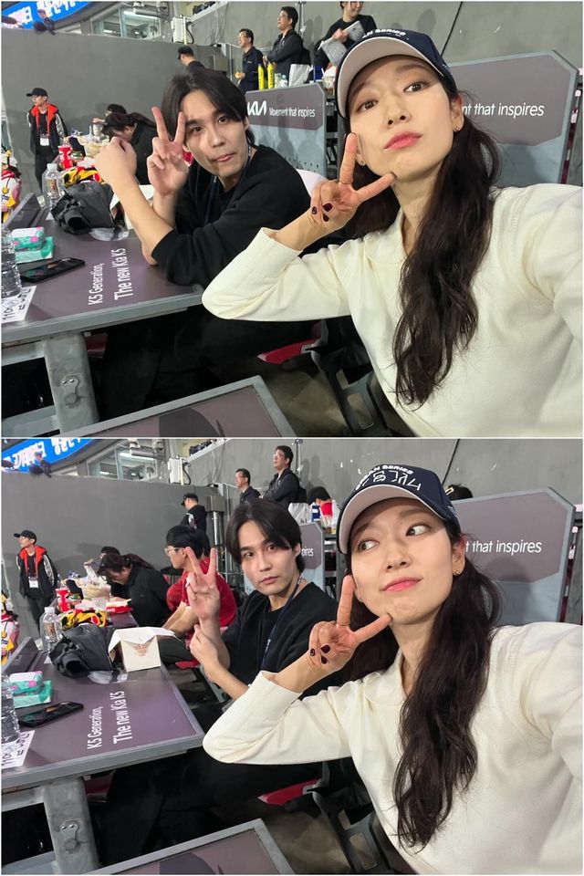 28일 오후 광주 기아챔피언스필드에서 열린 프로야구 '2024 신한 SOL 뱅크 KBO 포스트시즌' 한국시리즈 5차전 삼성 라이온즈와 KIA 타이거즈의 경기를 찾은 배우 박신혜가 시구 후 후배 장도하와 함께 야구를 관람하고 있다. /박신혜 인스타그램