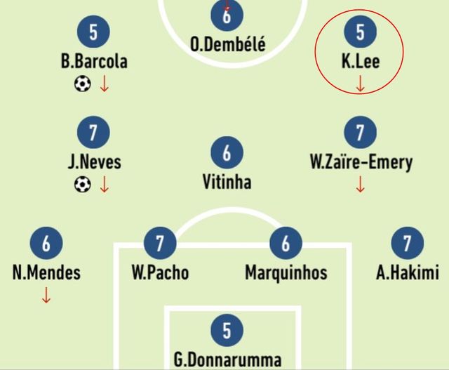 이날 이강인은 가짜 9번이 아닌 오른쪽 윙어로 선발 출전해 약 78분을 뛰었다. 그는 4-3-3 전형에서 바르콜라와 뎀벨레와 함께 최전방 스리톱을 구성했고, 9번 공격수 역할은 뎀벨레가 맡았다.