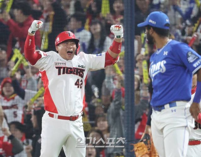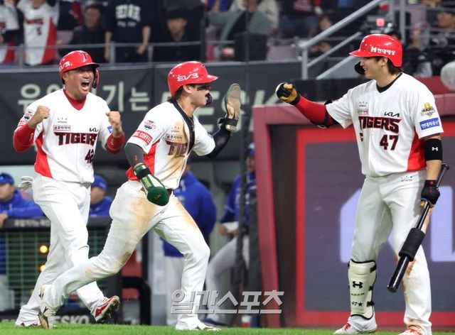 5회말 2사 만루 김도영 타석 때 투수 김윤수의 공이 뒤로 빠지자 3루 주자 김태군에 이어 2루 주자 박찬호가 홈으로 동점을 만들고 환호하고 있다.