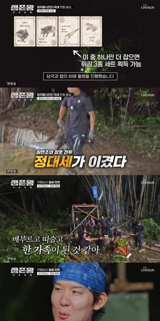 이후 국가대표팀, 군인팀, 피지컬팀은 연합을 맺고 사냥과 요리를 두고 각자 역할을 분담했다. 특히 국가대표팀, 군인팀, 피지컬팀은 성공적으로 사냥을 마치고 만찬을 즐겼다.