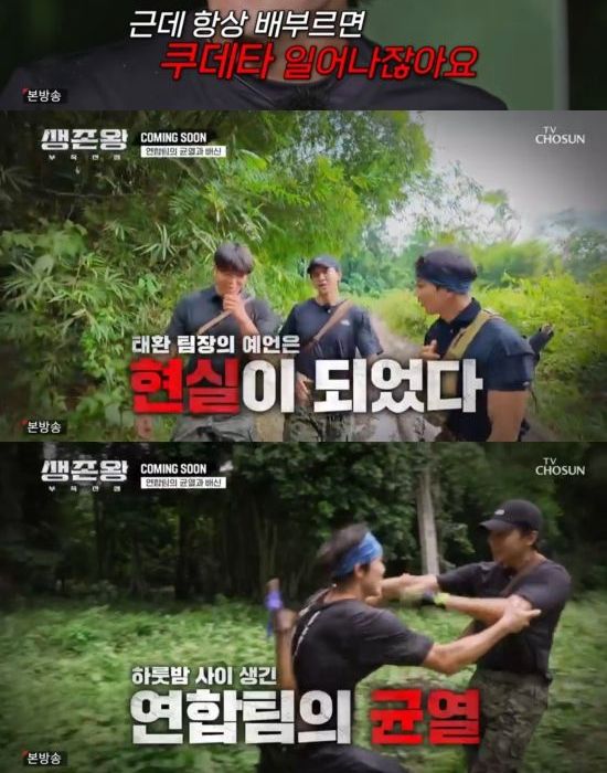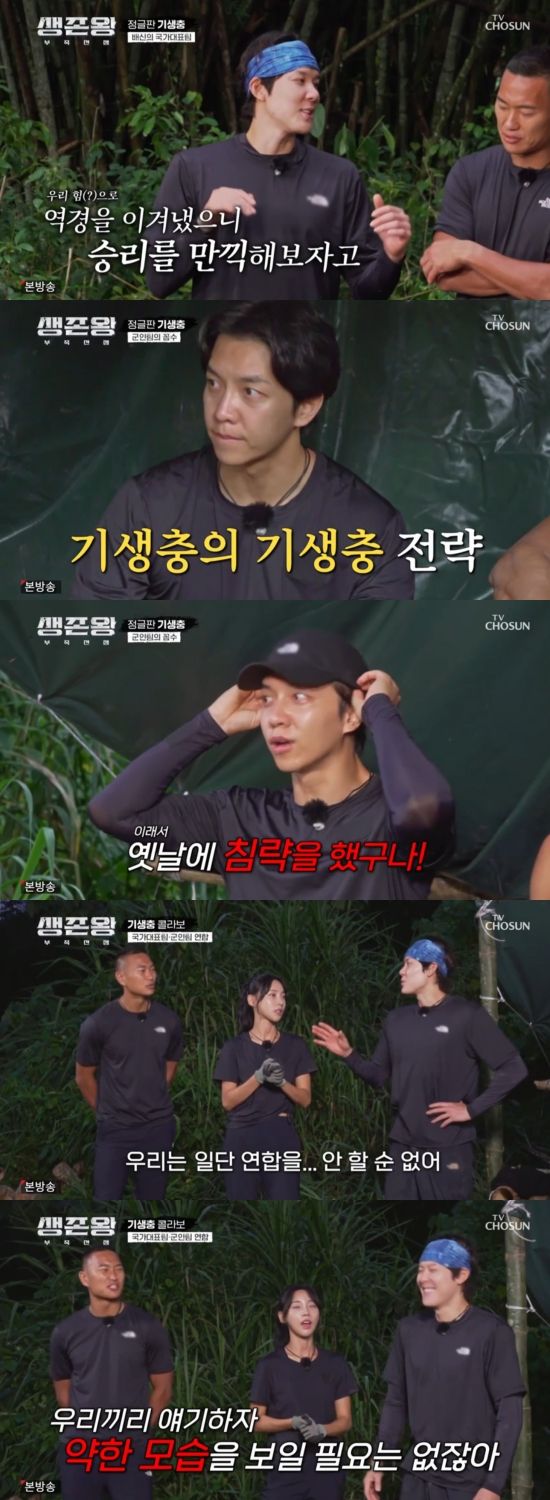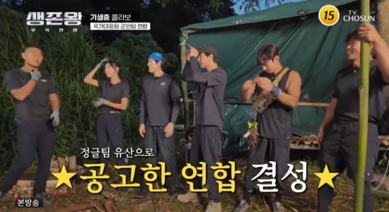 28일 방송된 TV조선 '생존왕'에서는 국가대표팀(박태환, 정대세, 김민지), 군인팀(이승기, 강민호, 아모띠), 피지컬팀(추성훈, 김동현, 박하얀)이 정글팀(김병만, 김동준, 정지현)이 방출된 사이 연합팀을 결성한 장면이 전파를 탔다.