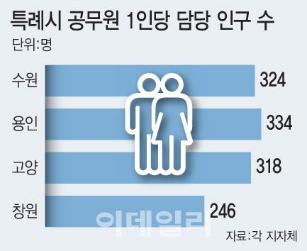 하지만 주민들에 대한 행정 서비스 질을 평가하는 척도 중 하나인 공무원 수 부분에서는 울산광역시가 약 7000명, 수원특례시는 약 3500명으로 울산이 수원에 비해 두 배가량 많다. 그 결과 울산광역시는 공무원 1인당 155명의 주민에 대한 행정 서비스를 제공하지만 수원특례시는 공무원 한 명이 울산의 두 배가 훌쩍 넘는 340명의 주민을 담당하고 있다.