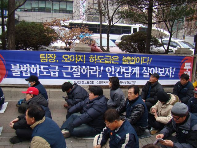 2007년 전국에 산재했던 지역건설노동조합들이 우여곡절 끝에 전국건설노동조합으로 통합되었다. 그 뒤로 많은 건설노동자들이 건설노조에 가입하였다. 건설노동자들이 건설노조에 가입하는 주된 이유는 역시 임금이었다. 건설노조 가입 전 건설노동자들은 중간착취를 일삼는 불법하도급 업자에게 뒷돈을 챙겨주거나 '똥떼기', '스메끼리(유보임금)'에 시달리고 있었다. 게다가 임금을 떼이는 일도 만연했다.