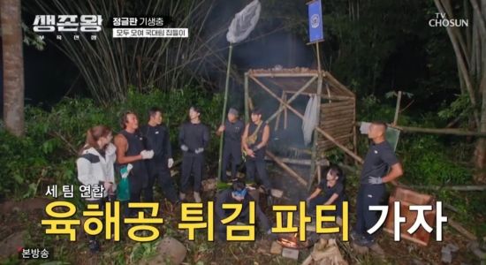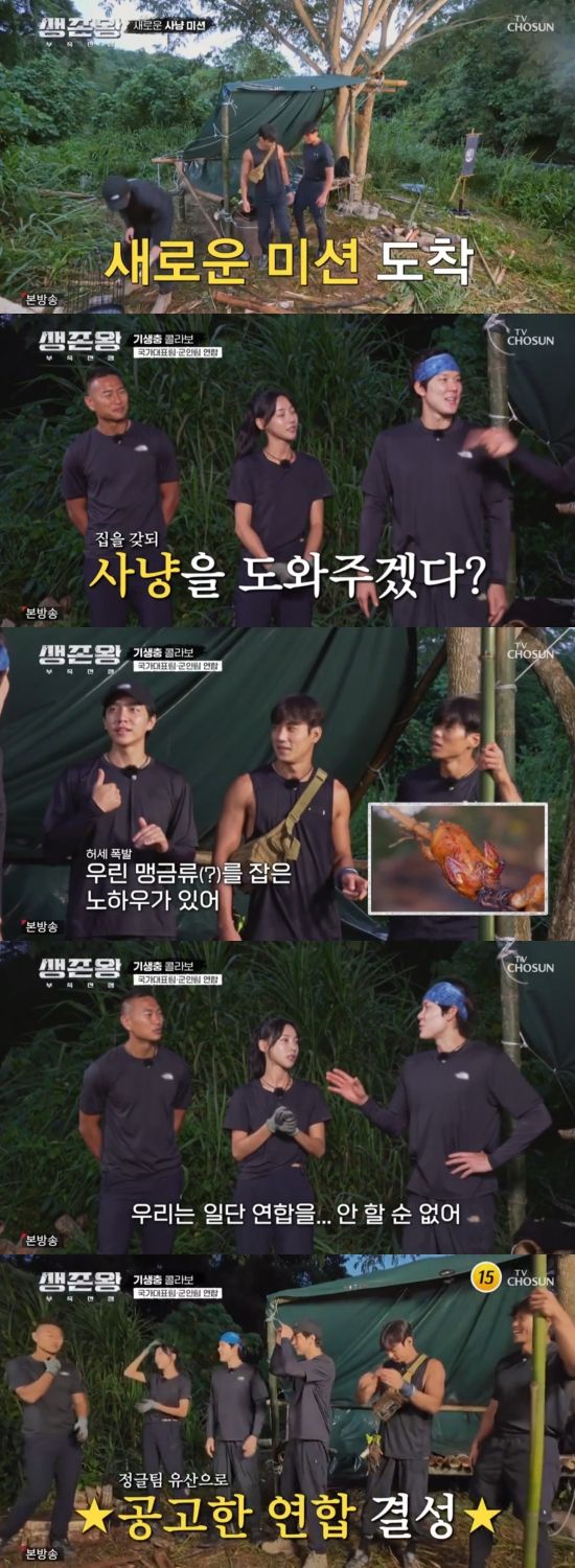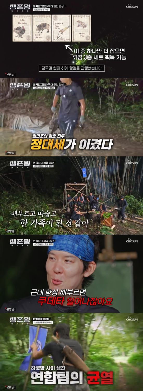 28일 방송된 TV조선 '생존왕'에서는 국가대표팀(박태환, 정대세, 김민지), 군인팀(이승기, 강민호, 아모띠), 피지컬팀(추성훈, 김동현, 박하얀)이 정글팀(김병만, 김동준, 정지현)이 방출된 사이 연합팀을 결성한 장면이 전파를 탔다.