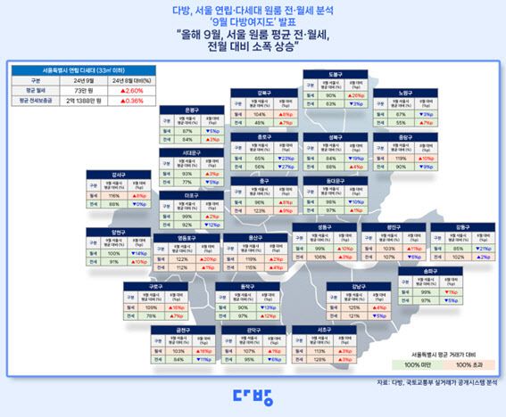 부동산 정보 플랫폼 ‘다방’은 지난 9월 서울 25개 자치구별 연립·다세대 원룸 (전용면적 33㎡ 이하)의 전·월세 수준을 분석한 결과 평균 월세는 73만원으로 직전달 대비 약 2만원(2.6%) 상승했다고 29일 밝혔다.