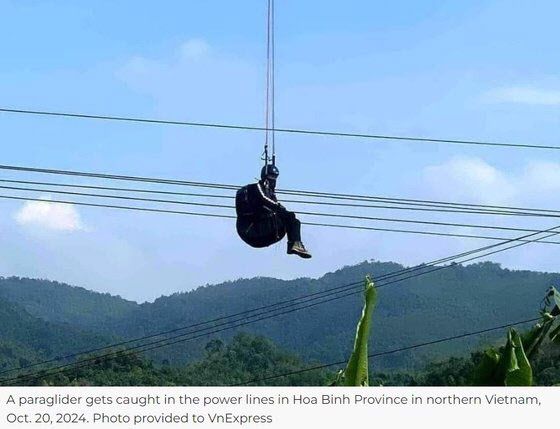 베트남 남성 A씨는 패러글라이딩을 하던 중 낙하산이 전선에 걸려 공중에 대롱대롱 매달리고 말았다.