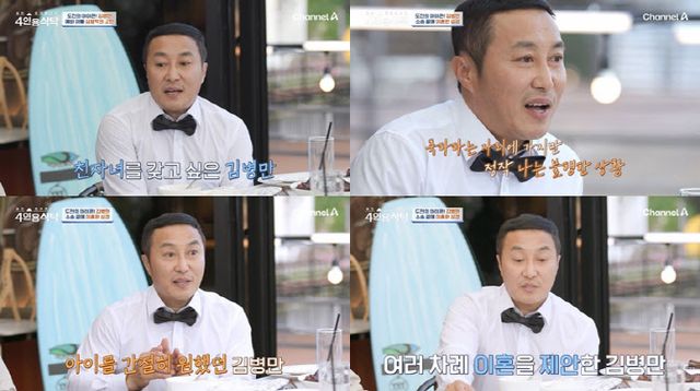 김병만은 절친들에게 이혼에 대한 속마음을 털어놨다. 그는 “나에게 피가 섞인 친자가 있길 바랐다. 나는 결혼식 사회 부탁도 많이 받았다. 사실 개인적으로 그때마다 정말 힘들었다”며 “남의 행복을 축하하는 자리에 가는데 내가 정작 행복하지 않고 나는 별거 생활을 하고 있었다”고 밝혔다.