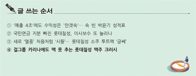 지난해 11월 출시된 크러시는 눈에 띌 만한 성과를 보여주지 못하고 있다. 29일 롯데칠성음료 자료에 따르면 크러시 출시 직후인 지난해 4분기 맥주 매출은 206억원을 기록했다.