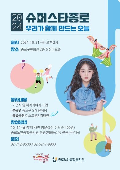 [파이낸셜경제=김영란 기자] 종로구가 경로의 달을 맞아 31일 목요일 14시부터 16시 30분까지 종로구민회관 2층 창신아트홀(지봉로5길 7-5)에서 '2024 슈퍼스타 종로'를 연다.