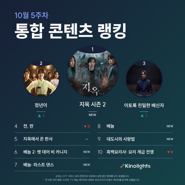 새로운 1위는 넷플릭스 시리즈 ‘지옥 시즌2’다. ‘지옥 시즌 2’는 지난 2021년 공개된 넷플릭스 시리즈 ‘지옥’의 후속편이다.
