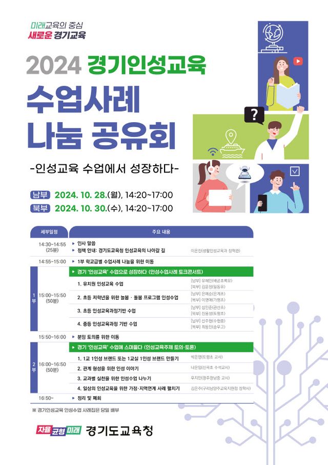 이지명 생활인성교육과장은 “교육공동체가 수업사례를 공유하며 교원의 인성교육 역량을 강화하고 수업에 인성교육이 스며들어 학생의 인성 함양에 도움이 될 것”이라며 “교사들이 교육과정과 연계해 인성교육을 실천할 수 있도록 적극 지원하겠다”고 말했다.