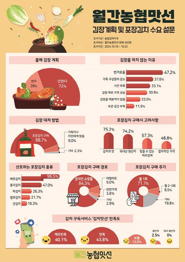 이번 조사는 월간농협맛선이 본격적인 김장철을 앞두고 소비자들의 김장 계획과 포장김치 수요를 파악하기 위해 지난 18일부터 23일까지 회원 약 500여명을 대상으로 진행됐다.