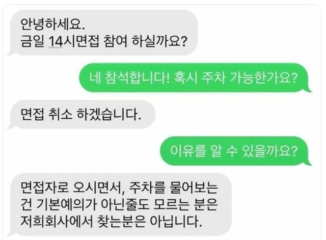 결국 주차 정도는 면접자가 알아서 해결할 일이지, 인사과에 물어볼 사안이 아니라는 의미다.