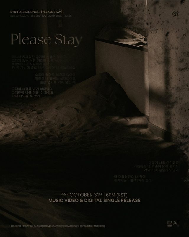 함께 공개된 리릭 포스터는 어둠 속 희미한 빛이 쌓여 있는 모래 더미를 비추고 있는 장면으로 쓸쓸하면서도 아련한 분위기를 자아냈다. 여기에 ‘그대의 숨결을 내게 불어줘요 그대만이 나를 태울 수 있어요 다시 타오를 수 있게’, ‘더 머물러 줘요 내 품에 꺼져가는 나를 태워줘 그대’ 등 가사 일부가 적혀 있어 비투비가 ‘불씨 (Please Stay)’를 통해 새롭게 보여줄 감성에 기대감을 높였다.