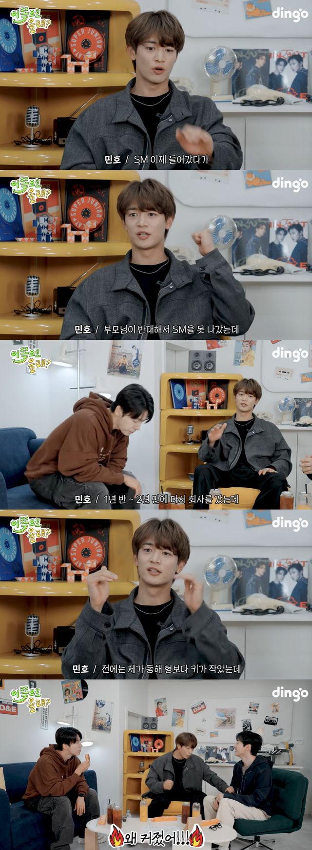 민호는 "내가 말 한마디 하면 형들 방송 은퇴해야한다"고 장난을 치며 "동해 형 기억이 아직 생생하다. 중2 때인가 제가 SM에 들어갔다가 부모님 반대로 SM에 못 갔었다"고 운을 뗐다.