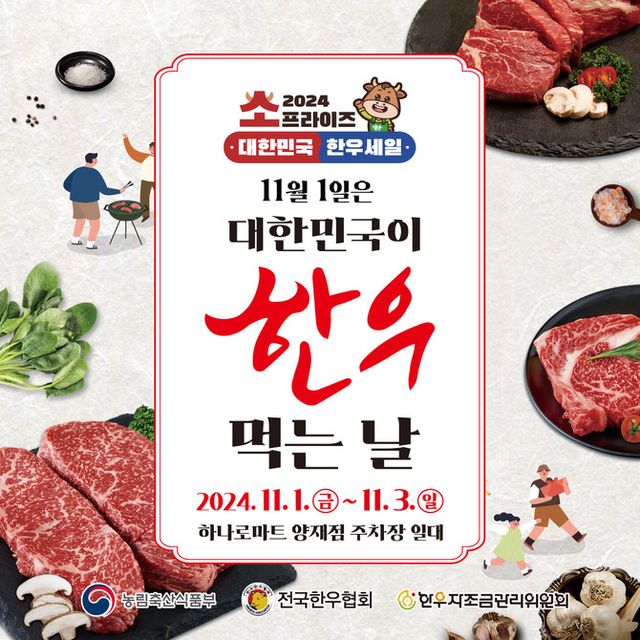 올해 한우먹는날 행사 또한 온오프라인으로 다양하게 준비됐다. 지난해에 이어 서울 하나로마트 양재점 앞 특별행사장에서 11월1일부터 3일까지 진행한다. 개막식에서는 한우곰탕 300인분 나눔과 전국한우협회 홍보대사 차민욱 셰프의 한우 라이브 쿠킹쇼가 펼쳐질 예정이다.