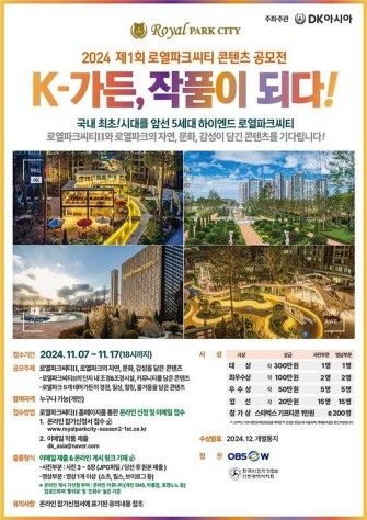 [프라임경제] DK아시아가 '로열파크씨티Ⅱ'와 5개 테마가든으로 오픈한 로열파크의 정원을 소재로 '2024 제1회 로열파크씨티 콘텐츠 공모전'을 개최한다.