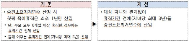 개정안에 따라 공무원은 내년 1월부터 대상 자녀와 관계없이 자녀당 최대 3년인 육아휴직 모든 기간이 승진을 위한 근무경력으로 인정된다. 기존에는 첫째 자녀는 승진 소요 최저연수인 최대 1년까지만 근무경력으로 인정하고 둘째 이후부터 모든 기간을 인정했다.