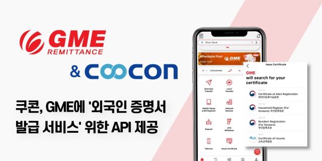 비즈니스 데이터 플랫폼 기업 쿠콘이 해외 송금 전문 핀테크 기업 ‘글로벌머니익스프레스’(이하 GME)에 ‘We-Check’를 제공해 ‘외국인 대상 증명서 발급 서비스’를 지원한다고 29일 밝혔다.