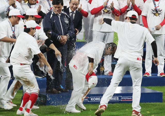 한국시리즈 MVP 차지한 김선빈이 동료들로부터 물세례를 받고 있다. / 뉴스1