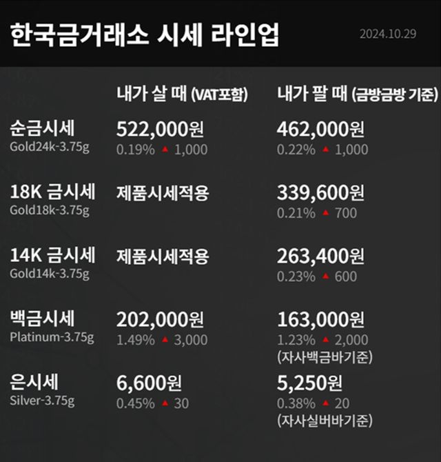 순금(24K) : 매입가 52만 2000원 / 매도가 46만 2000원