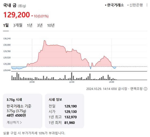 국내 금시세(금값)가 29일 오후 보합세(전 거래일 대비)를 보이고 있다.