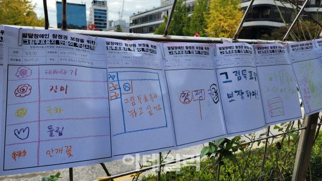 장애인차별금지추진연대를 비롯한 5곳의 발달장애인 단체는 29일 오전 서울 서초구 서울중앙지방법원 앞에서 기자회견을 열고 그림 투표용지를 통한 발달장애인들의 참정권 보장을 요구하며 발달장애인들이 직접 그린 그림 탄원서를 제출했다.